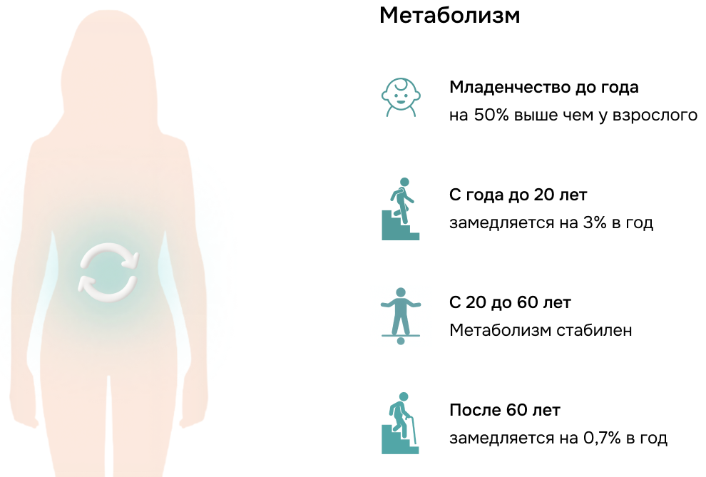 Не в возрасте дело: Исследования показывают, что с 20 до 60 лет общий ежедневный расход энергии примерно одинаковый. Замедление метаболизма на 0,7% ежегодно происходит после 60 лет и связано с потерей мышечной массы. Меньше мышц — меньше калорий сжигается в состоянии покоя. При сидячем образе жизни это неминуемо ведет к набору веса1.