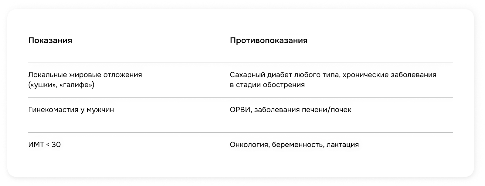 Важно: это не метод общего похудения, а способ коррекции рельефа тела при ИМТ до 30.