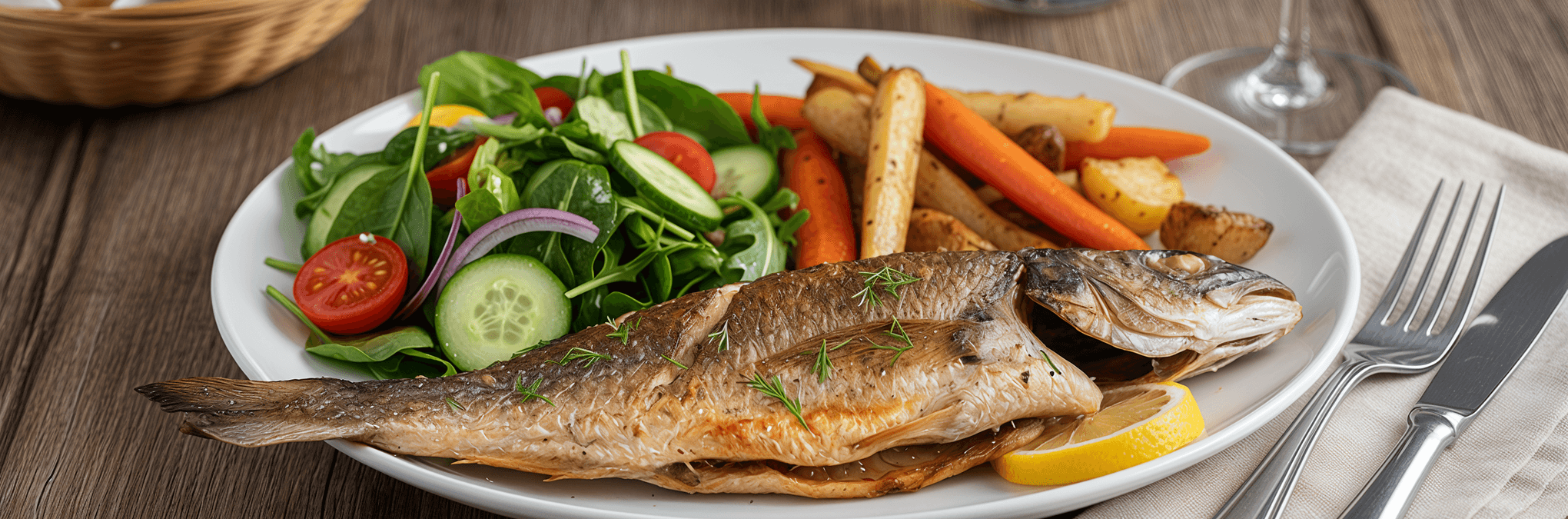 - ¼ тарелки: Полезные углеводы (цельнозерновые крупы, киноа, сладкий картофель).