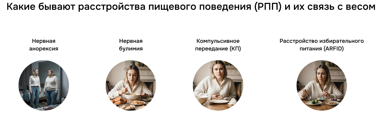 Не все РПП приводят к набору веса. Некоторые, наоборот, вызывают его критическую потерю. Вот основные типы расстройств и их влияние на массу тела.