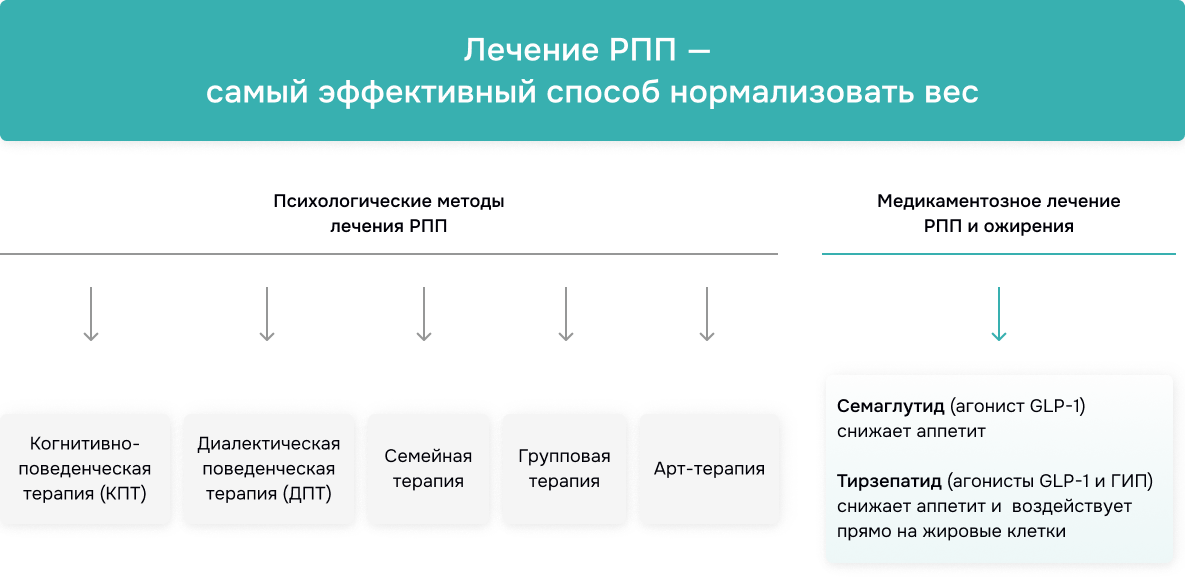 Хотя «таблетки от РПП» не существует, некоторые препараты помогают контролировать симптомы. Например, агонисты GLP-1 (семаглутид) и препараты нового класса на основе тирзепатида с двойным механизмом действия: агонист GLP-1 и агонист ГИП (воздействует прямо на жировые клетки), первоначально созданные для лечения диабета, показали эффективность в снижении аппетита и количества эпизодов компульсивного переедания, помогая нормализовать вес. Детальный разбор всех механизмов работы семаглутида читайте в статье.